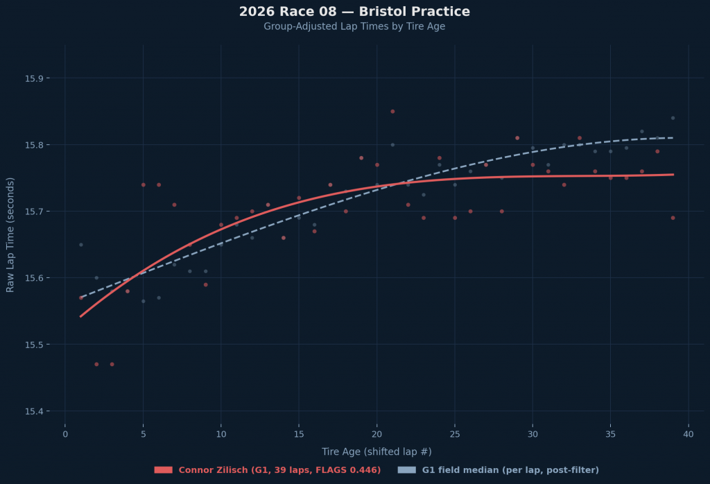 In the graph above, you can see that after about 20 laps, Zilisch’s lap times really flatten out and he’s way ahead of his practice group’s median lap time.