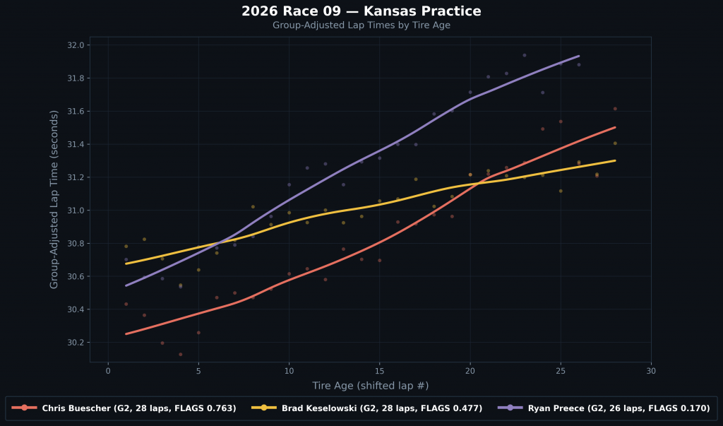His curve above, in yellow, shows that he might have elite long-run speed, as he ends up faster than Buescher after around lap 20.