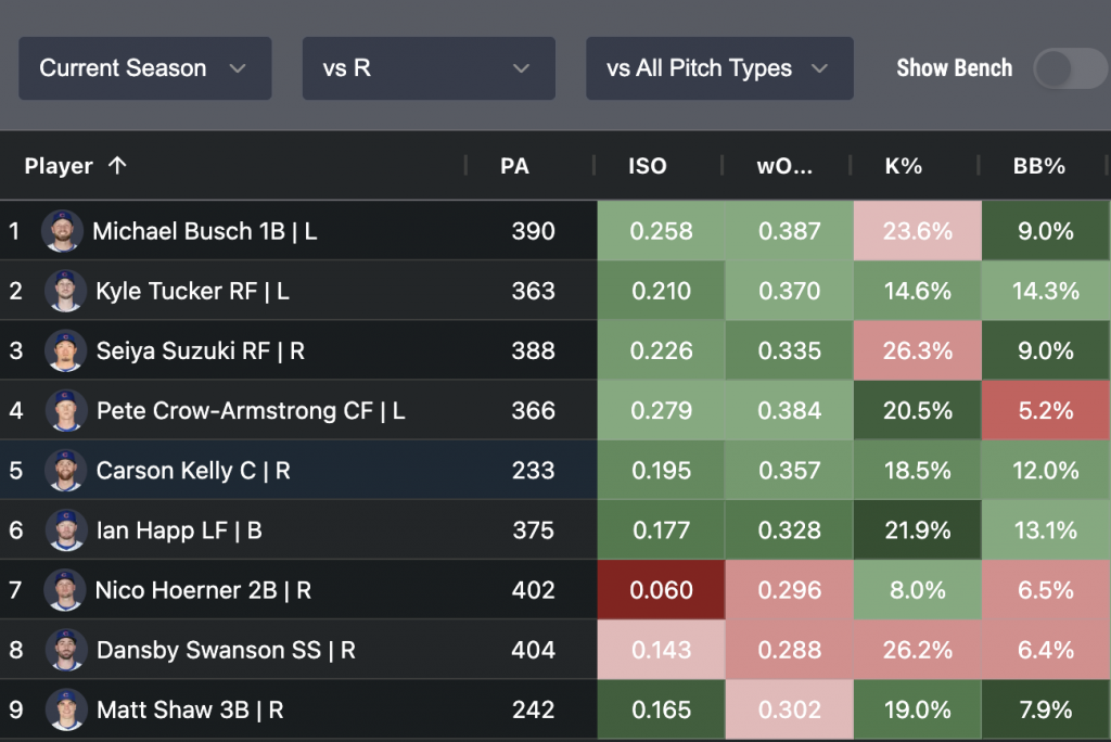 The only real question is, what is the best way to stack the Cubs on this slate? The top projected stack in THE BAT X is a bit of an unconventional 1-2-3-4-8 combination, including shortstop Dansby Swanson. However, you can also choose to replace Swanson with projected No. 5 hitter Carson Kelly. Not only does that increase the correlation, but it takes care of the tricky catcher spot in your lineup. It’s also -$100 cheaper, and Kelly has basically torn the cover off the ball all season. His numbers against righties have been far more impressive than Swanson’s (via Plate IQ):