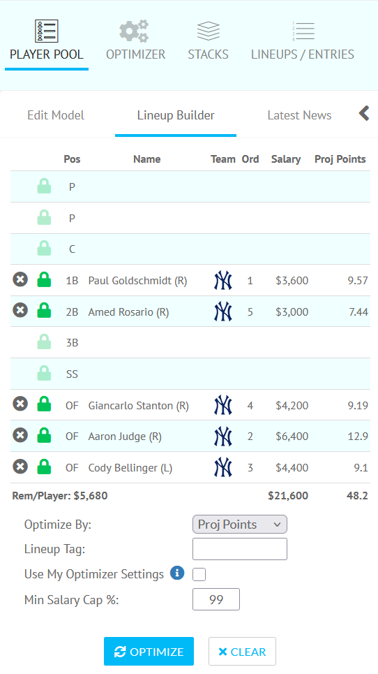 With the Lineup Builder, it’s easy to incorporate stacks into DFS rosters.