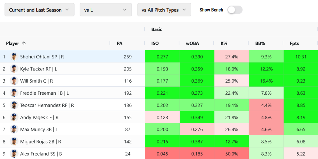 I turned to Plate IQ to see if any lesser-known Dodgers stood out against left-handed pitching, and there was an obvious answer: