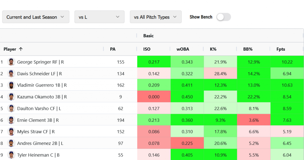 No surprise to see Vlad Jr. and George Springer ($5,200) leading the charge. Both are great options if you go cheap at pitcher or elsewhere in the lineup.