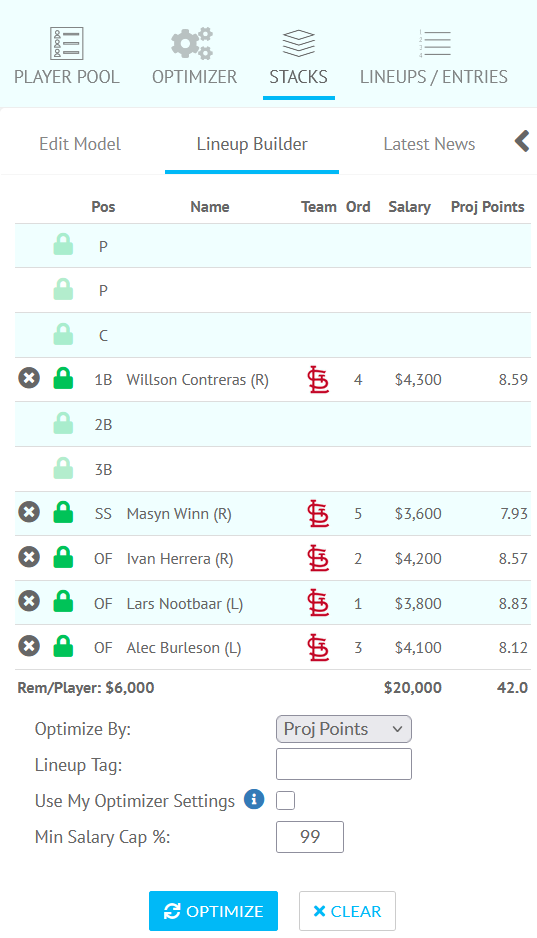 With the Lineup Builder, it’s easy to incorporate stacks into DFS rosters.