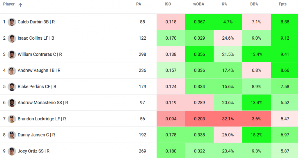 With a 5.1-run total, the Brewers trail just behind the leaders of the day in terms of their implied total. That makes Durbin a very strong value from the leadoff spot in their lineup, with just a $3,400 salary.