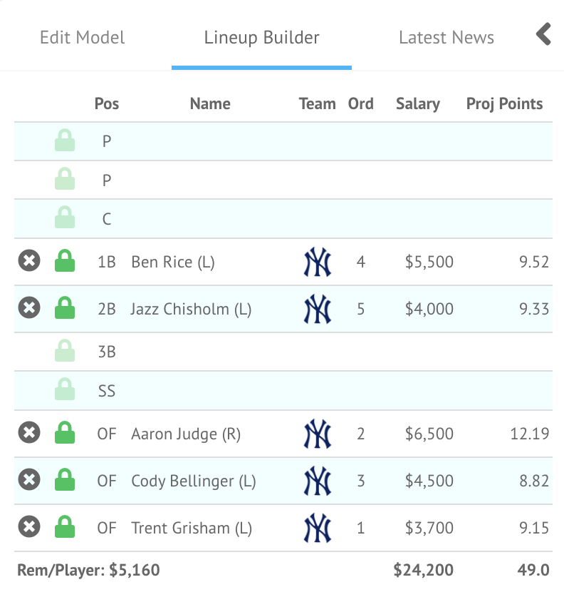 The top DraftKings stack in the FantasyLabs MLB Player Model when generated by projected points belongs to the New York Yankees:
