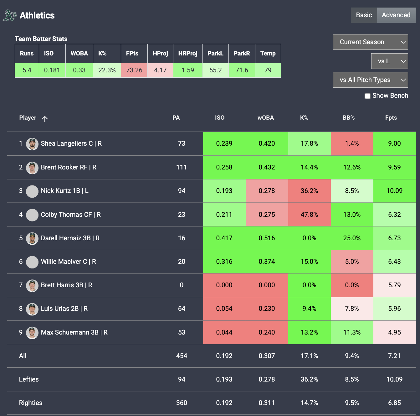 Since he’s still at the minimum salary, he’s a good way to save some cap space and still get the potential for good production. The A’s should be in a good spot against lefty Tyler Anderson ($6,300) at hitter-friendly Sutter Health Park, and here’s how they look in our Plate IQ tool: