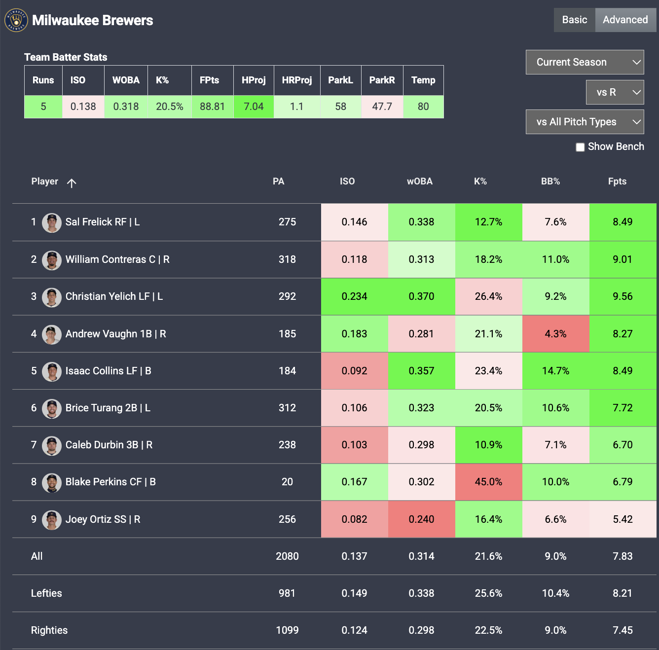 In the aggregate projections, Vaughn has the highest Projected Plus/Minus and the second-highest Points/Salary of all hitters. Here’s how he and the Brewers stack up against Irvin according to our Plate IQ tool: