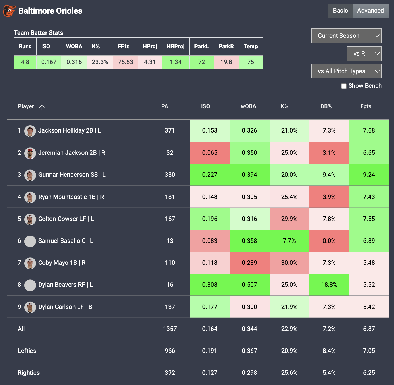 While his long-term role on the team is uncertain, he’s hot enough right now to be an excellent bargain play as the O’s take on Javier. Here’s how the rest of the Orioles stack up in this favorable spot at Oriole Park at Camden Yards with the wind blowing out according to our Plate IQ tool: