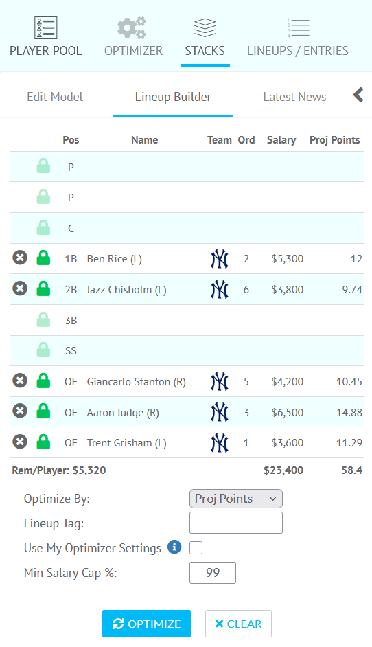 With the Lineup Builder, it’s easy to incorporate stacks into DFS rosters.