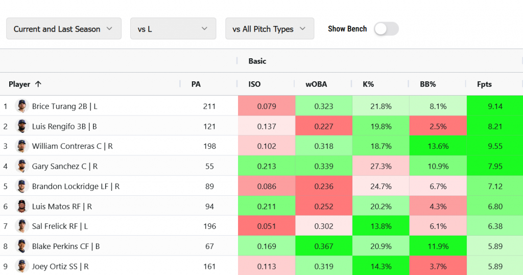 Unfortunately, we don’t have a ton of great options from Milwaukee, whose lineup is broadly worse against left-handed pitching. However, using PlateIQ, I was able to find a couple of bright spots.