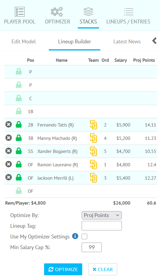 With the Lineup Builder, it’s easy to incorporate stacks into DFS rosters.