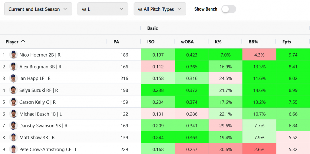 I don’t expect the Cubs to be popular today, since they’re somewhat high priced and have a tough matchup against the Phillies’ Cristopher Sanchez ($9,000), who has a 1.59 ERA through five starts this season. However, he’s a lefty, which plays to the Cubs’ strengths, and they come into the game with a 135 wRC+ vs. LHP, second best in the league.