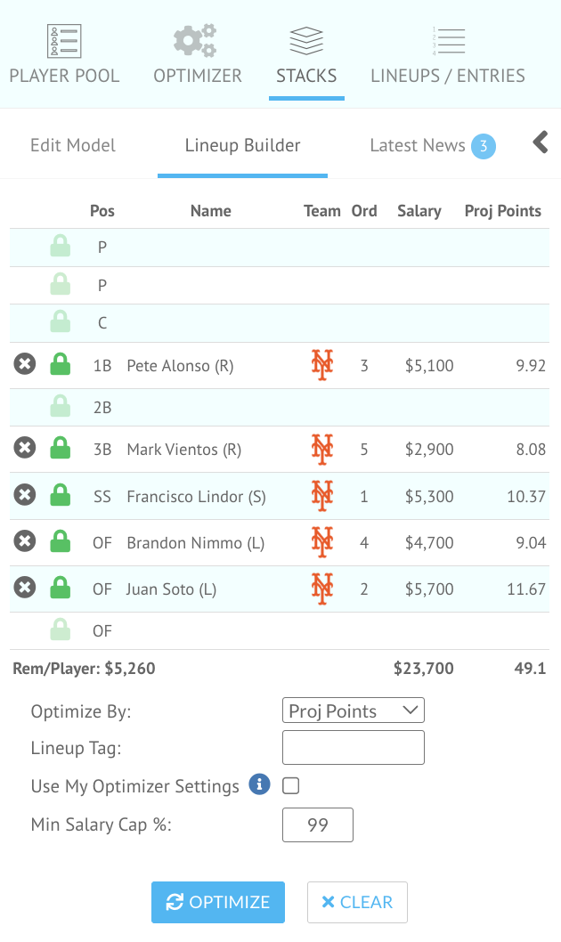 With the Lineup Builder, it’s easy to incorporate stacks into DFS rosters.