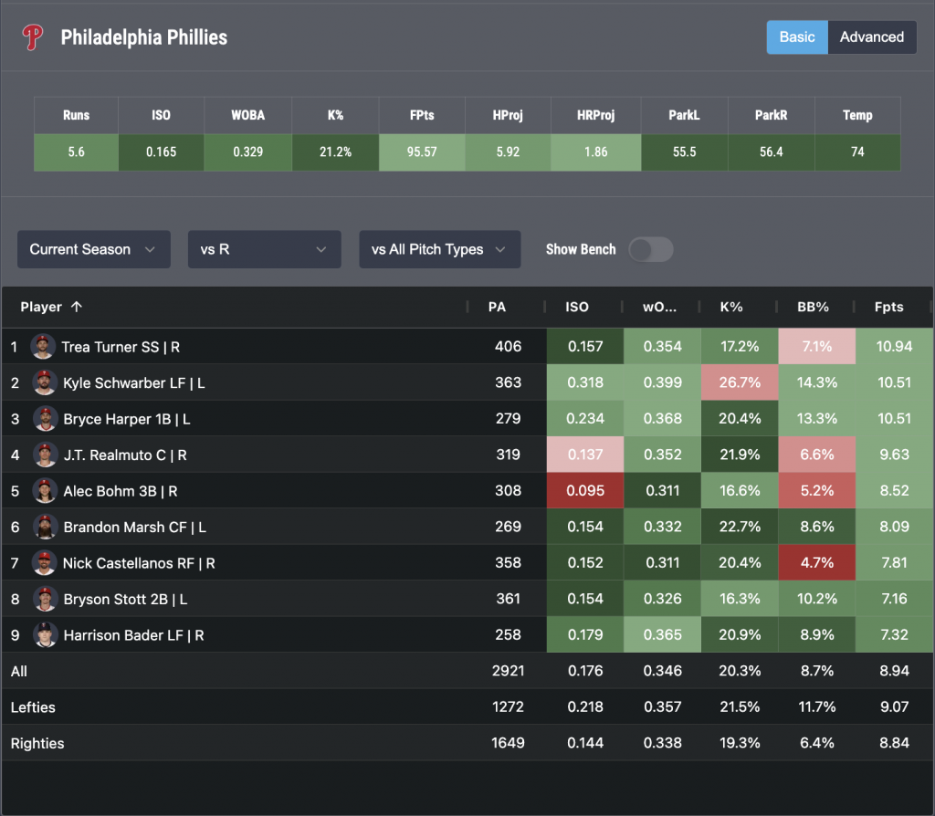 The Phillies have the highest implied run total on the slate, and here’s how the lineup stacks up against Quantril in our Plate IQ tool: