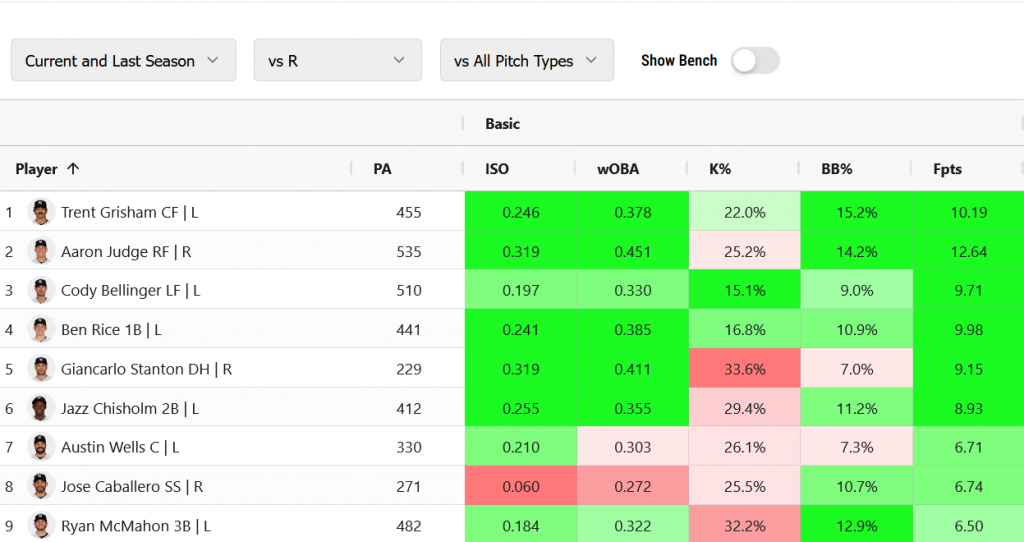 That is, except Trent Grisham. His numbers in PlateIQ against righties are almost as elite as the more recognizable hitters, making him an excellent way to get some Yankees exposure without breaking the bank:
