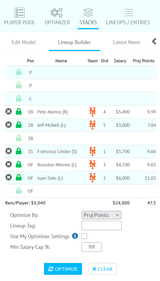 With the Lineup Builder, it’s easy to incorporate stacks into DFS rosters.