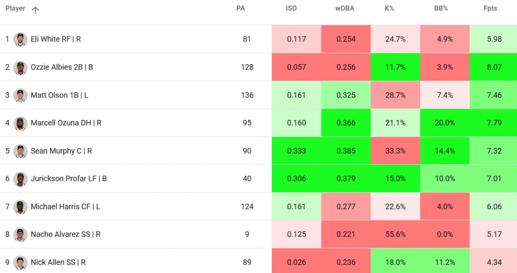 For this example, we created a 50/50 blend with THE BAT X and the FantasyLabs projections to pinpoint some hitters that stand out.