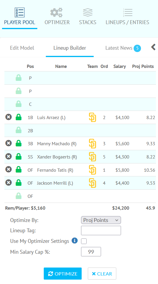 With the Lineup Builder, it’s easy to incorporate stacks into DFS rosters.