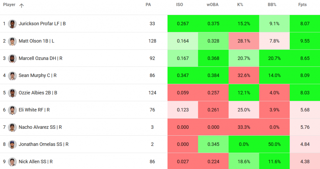 For this example, we created a 50/50 blend with THE BAT X and the FantasyLabs projections to pinpoint some hitters that stand out.