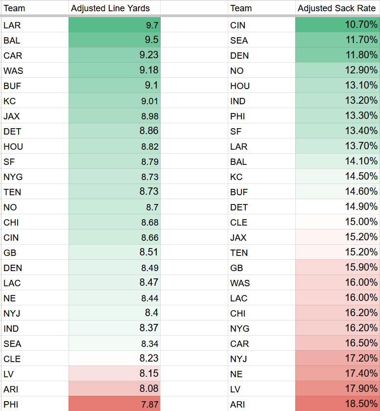 Adjusted line yards data became matchup-adjusted starting in Week 5 but will continue to get stronger as we get more robust sample sizes. That’s a good thing for the process of this article, since we don’t need to parse out which team’s strong numbers are a result of soft matchups compared to solid play.