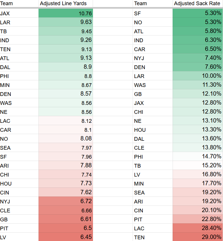 This is the third straight matchup for the Broncos offensive line against middle-of-the-pack defensive units, after they faced the Titans (14th) and Colts (17th) in the first two weeks. They’ve lived up to Anderson’s preseason evaluation as a top-tier unit, having allowed the lowest adjusted sack rate in the league while producing a top 10 adjusted line yards.