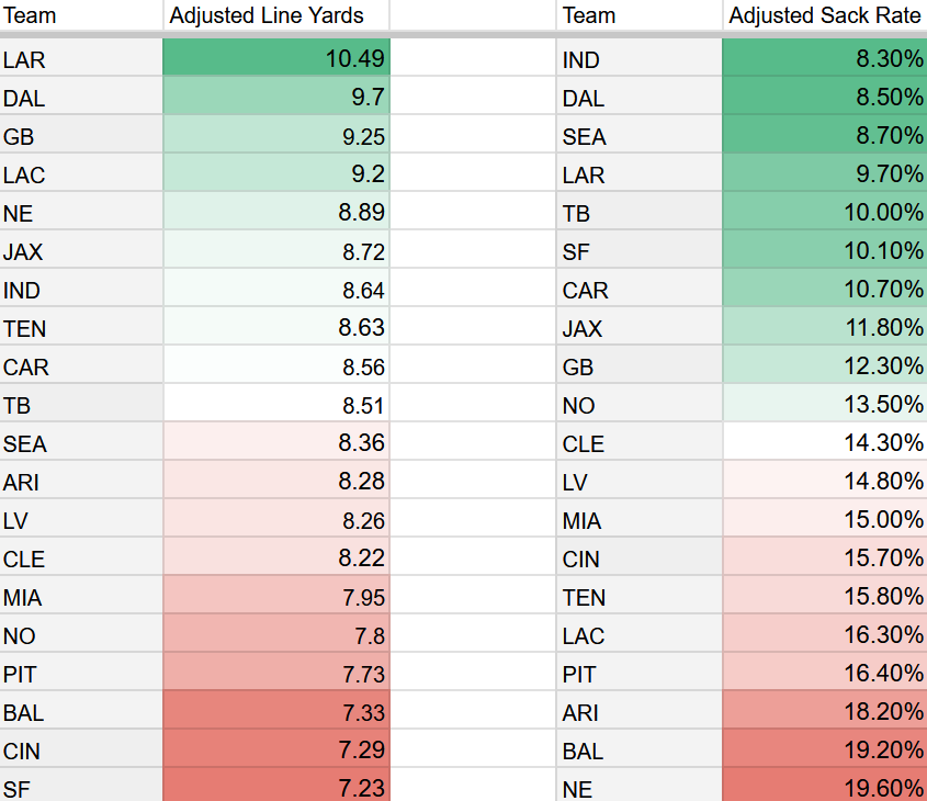 Adjusted line yards data became matchup-adjusted starting last week but will continue to get stronger as we get more robust sample sizes. That’s a good thing for the process of this article, since we don’t need to parse out which team’s strong numbers are a result of soft matchups compared to solid play.