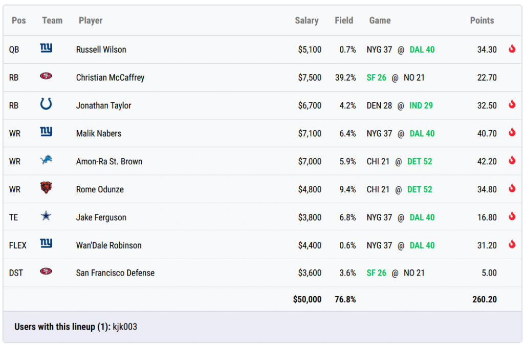 That wasn’t a mistake kjk003 made, with nearly three times the fields’ exposure to Taylor, as well as heavy bets on McCaffrey and De’Von Achane. Only one of those really worked out — but that’s all it takes.