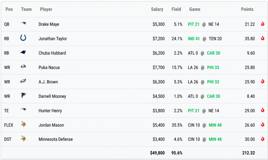 The only player we’ve yet to mention from this lineup is Jonathan Taylor. The Colts RB came into the week behind only Christian McCaffrey in opportunities on the season and saw 20 more touches in a dominant Colts win. The game script, matchup, and usage were all strong for Taylor, who came in a good bit cheaper than the other elite backs on the slate. Taylor was ehafner’s most rostered player outside of Jordan Mason.