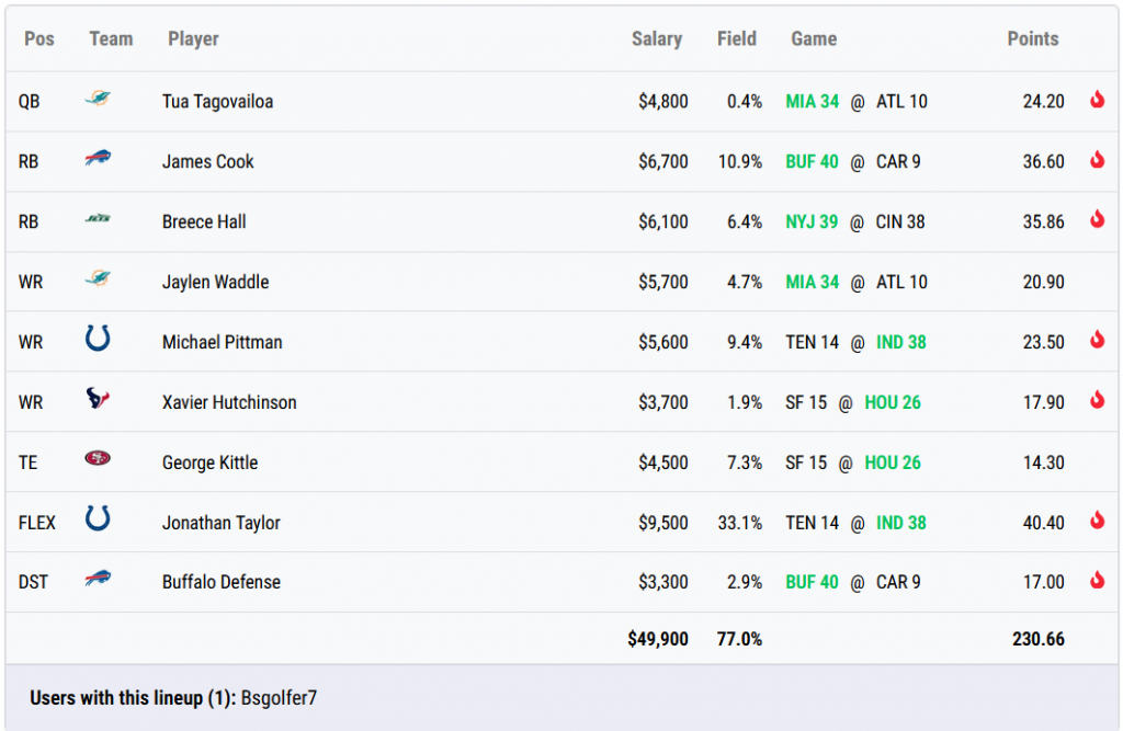 Bsgolfer7 had more than double the field’s exposure to Hall overall, and wisely went three running backs in this lineup since that’s where the better plays were this week.