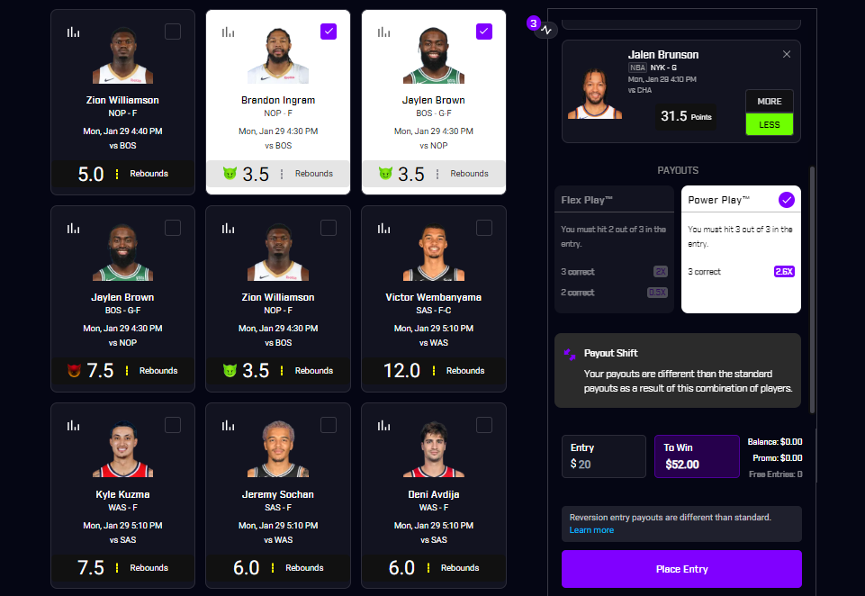 There are two ways that you can place an entry with PrizePicks. The first option is making your entry a “Power Play”, which means that you have to hit on all your entries for a higher payout. With a “Flex Play” entry, you are allowed to miss one of your picks, but that also comes with a drawback, as your payout will be lower than with a “Power Play”.