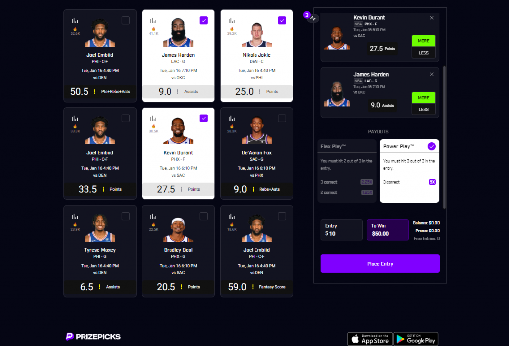 Let’s use the three picks provided above as an example. I picked Kevin Durant to get more than 27.5 points and James Harden to get more than 9.0 assists. My last pick was Nikola Jokic getting less than 25.0 points. With the “Power Play” option, I have to hit on 3 out of 3 of my picks to get a payout. With the “Flex Play” option I only have to hit on 2 out of 3 picks, but that also means a lower payout.