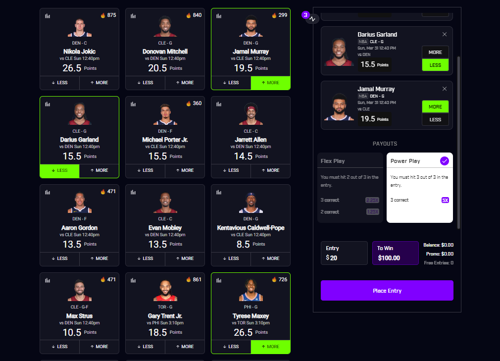 Once you make your picks, you can choose to place your entry as a “Power Play” or a “Flex Play”. A “Power Play” means you have to get all your picks right, but it has a higher payout than a “Flex Play”, which allows you to miss one of your picks in exchange for a lower payout multiplier on your entry.