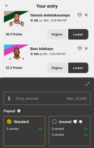 Here is an example. I selected Bam Adebayo and Giannis Antetokounmpo to get lower than their projections of 22.5 points and 30.5 points, respectively. My last selection (not pictured in the screenshot) was Kevin Durant to get higher than his projection of 26.5 points.