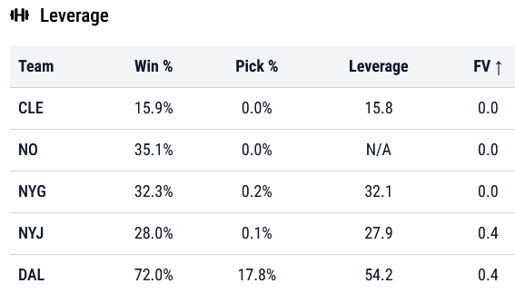 If you can fade a popular team with strong future value and advance, it’s a double-whammy of leverage. Not only were you unique this week, but you’ll also be able to use a team that most of the field doesn’t have later in the season.